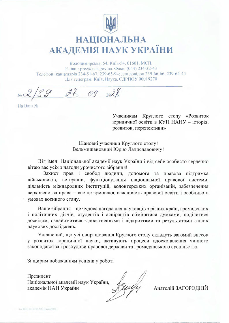 Віцепрезидент НАН України, академік НАН України Сергій Пирожков передав вітання учасникам круглого столу від Президента НАН України Анатолія Загороднього, в якому було зазначено про важливість захисту прав і свобод людини, допомоги та правової підтримки військовиків, ветеранів, функціонування національної правової системи, діяльності міжнародних інституцій, волонтерських організацій, забезпечення верховенства права, що зумовлює важливість правової освіти і особливо в умовах воєнного стану.