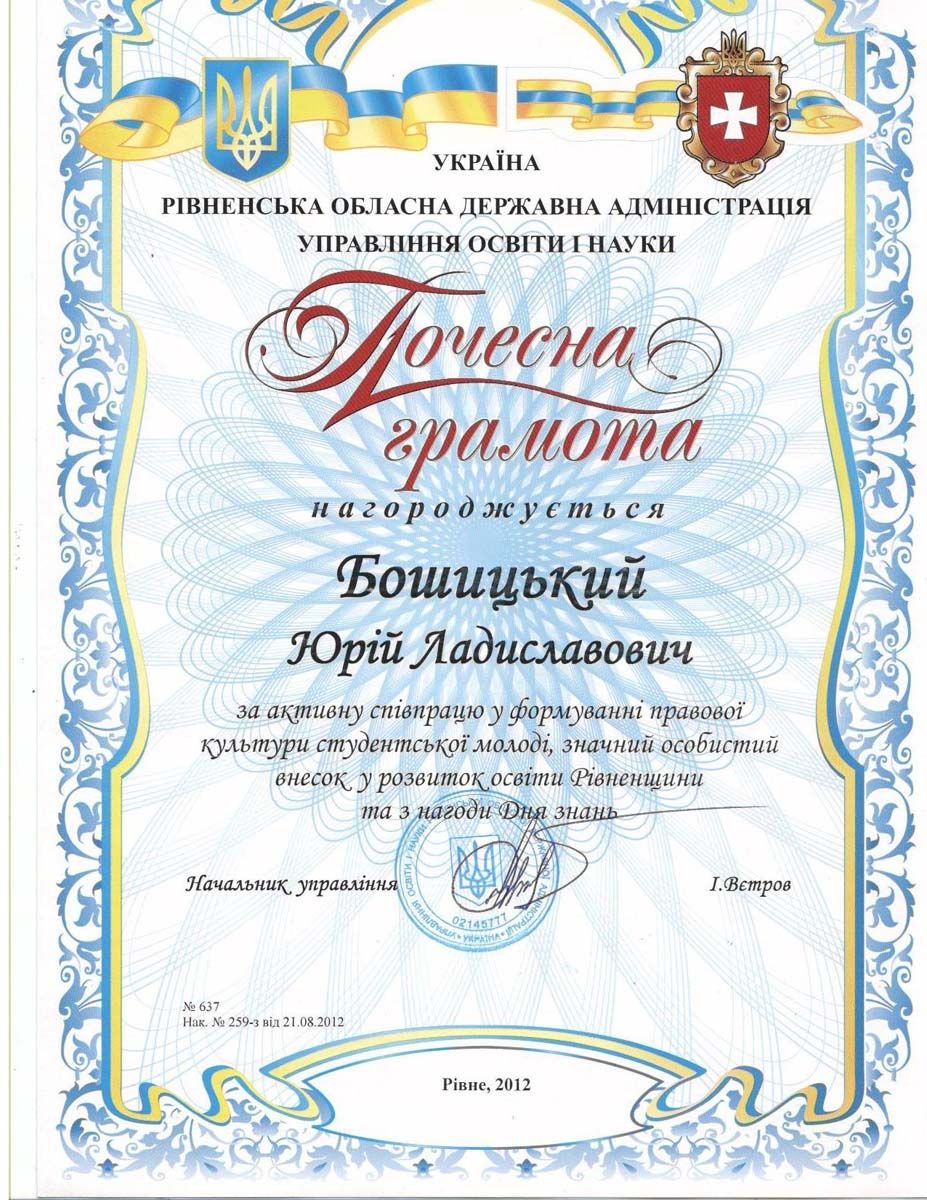 ![]() | За активну співпрацю у формуванні правової культури студентської молоді, значний особистий внесок у розвиток освіти Рівненщини та з нагоди Дня знань наказом управління освіти і науки Рівненської обласної державної адміністрації від 21 серпня 2012 року №259-з Ю.Л. Бошицького нагороджено Почесною грамотою управління освіти і науки Рівненської обласної державної адміністрації.