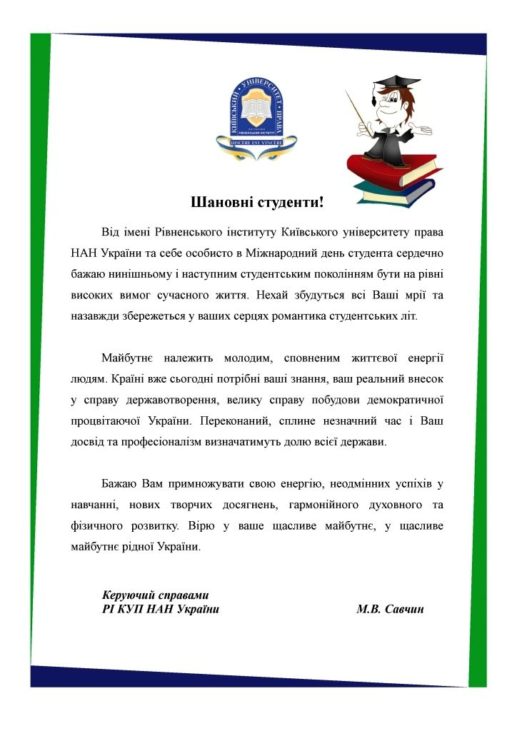 Вітання керуючого справами Рівненського інституту КУП НАН України М.В. Савчина з Днем Студента!