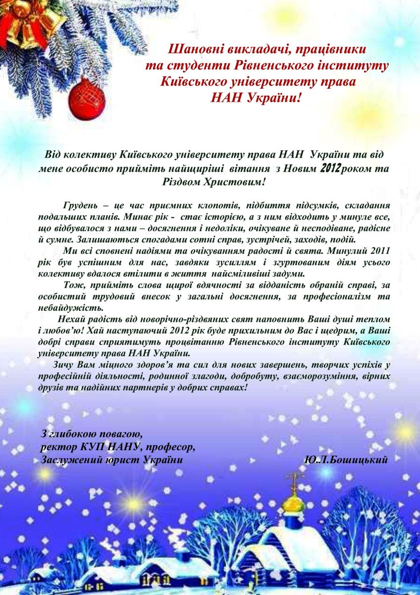 Вітання ректора КУП НАН України з Новим 2012 роком та Різдвом Христовим!