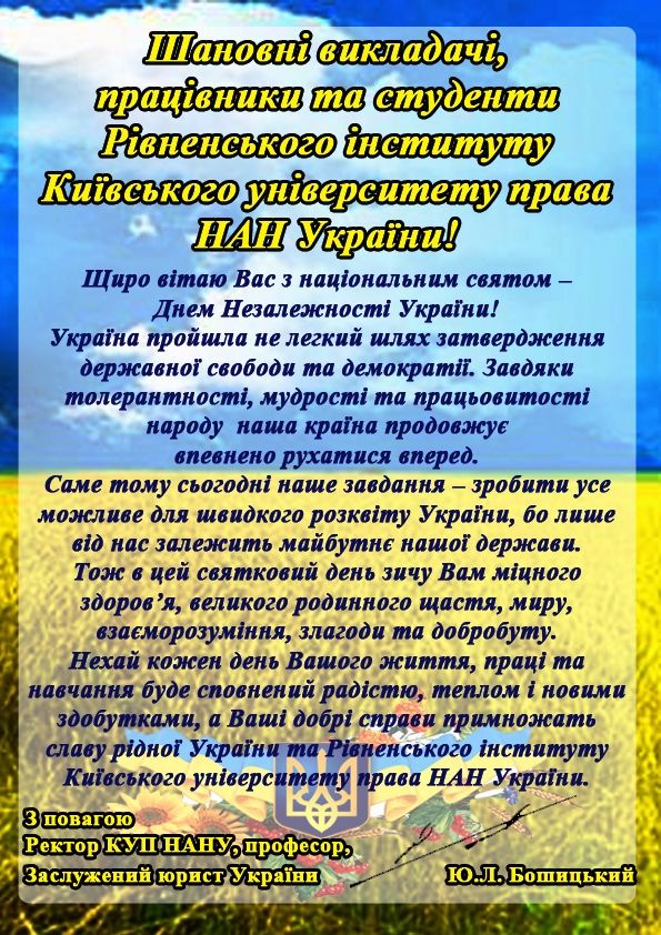 Вітання ректора КУП НАНУ з Днем Незалежності України