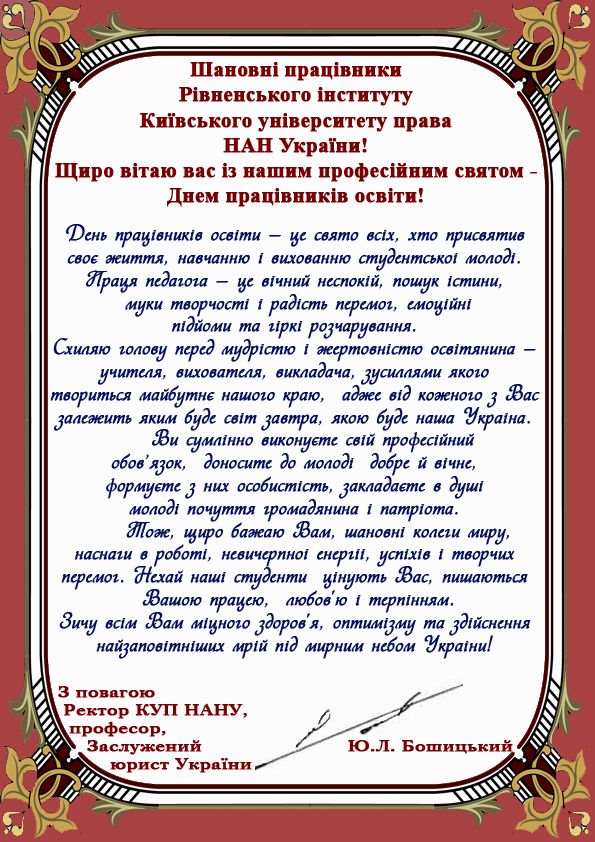Вітання ректора КУП НАНУ з Днем працівників освіти