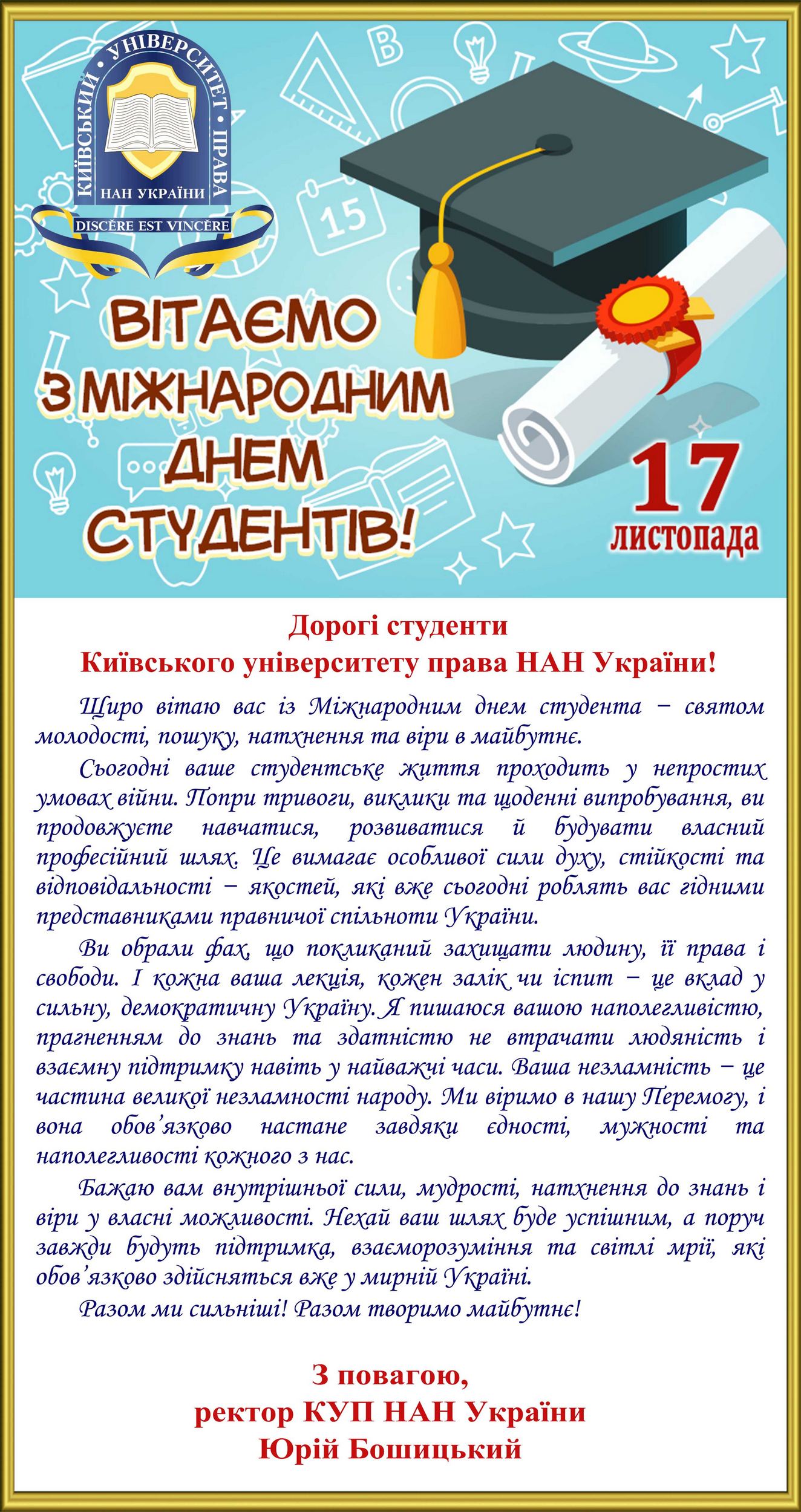 Вітання ректора КУП НАНУ з Міжнародним Днем студента