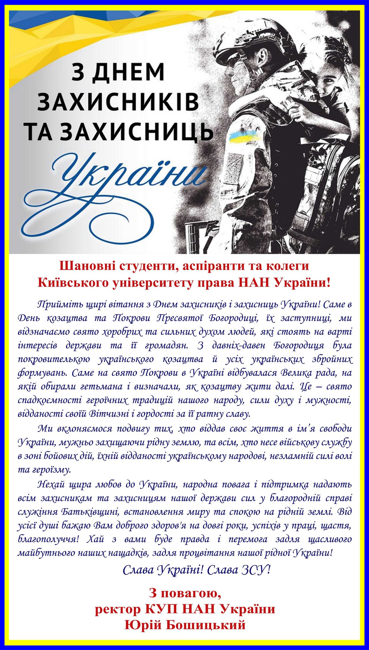 Вітання ректора з Днем захисників та захисниць України