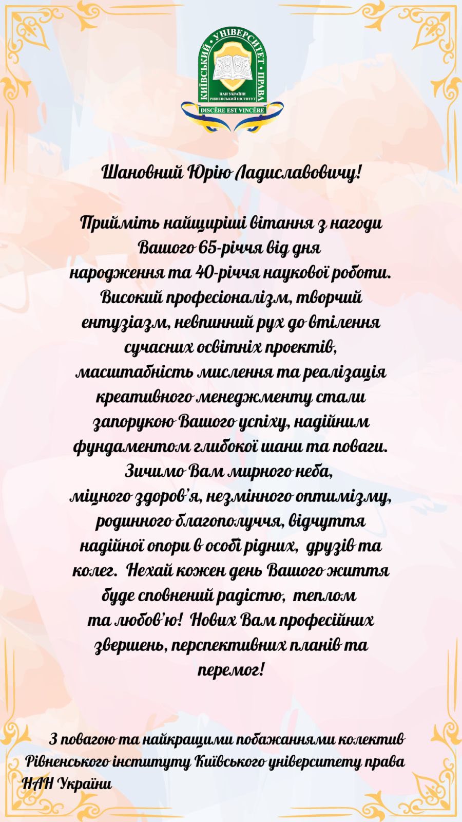 Вітання ректору КУП НАНУ з нагоди 65-річчя від дня народження та 40-річчя наукової роботи.