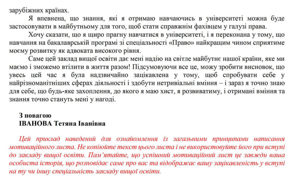 Також Ви можете ознайомитись з прикладом мотиваційного листа на спеціальність 081 Право за посиланням https://osvita.ua/consultations/motivation-letters/74356/