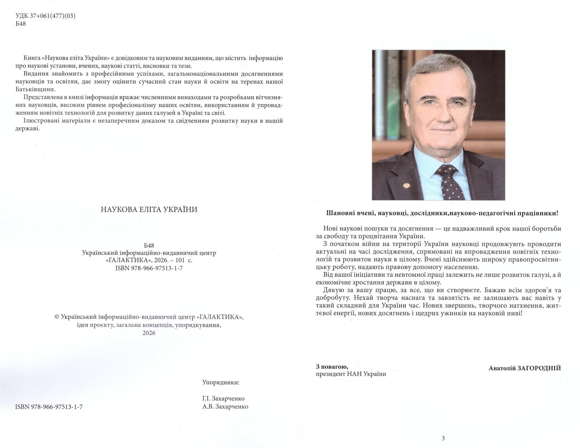 Книга «Наукова еліта України» є довідковим і науково-публіцистичним виданням, що репрезентує сучасний інтелектуальний потенціал держави, висвітлюючи діяльність провідних учених, наукових установ, освітян, дослідників і представників академічної спільноти України.