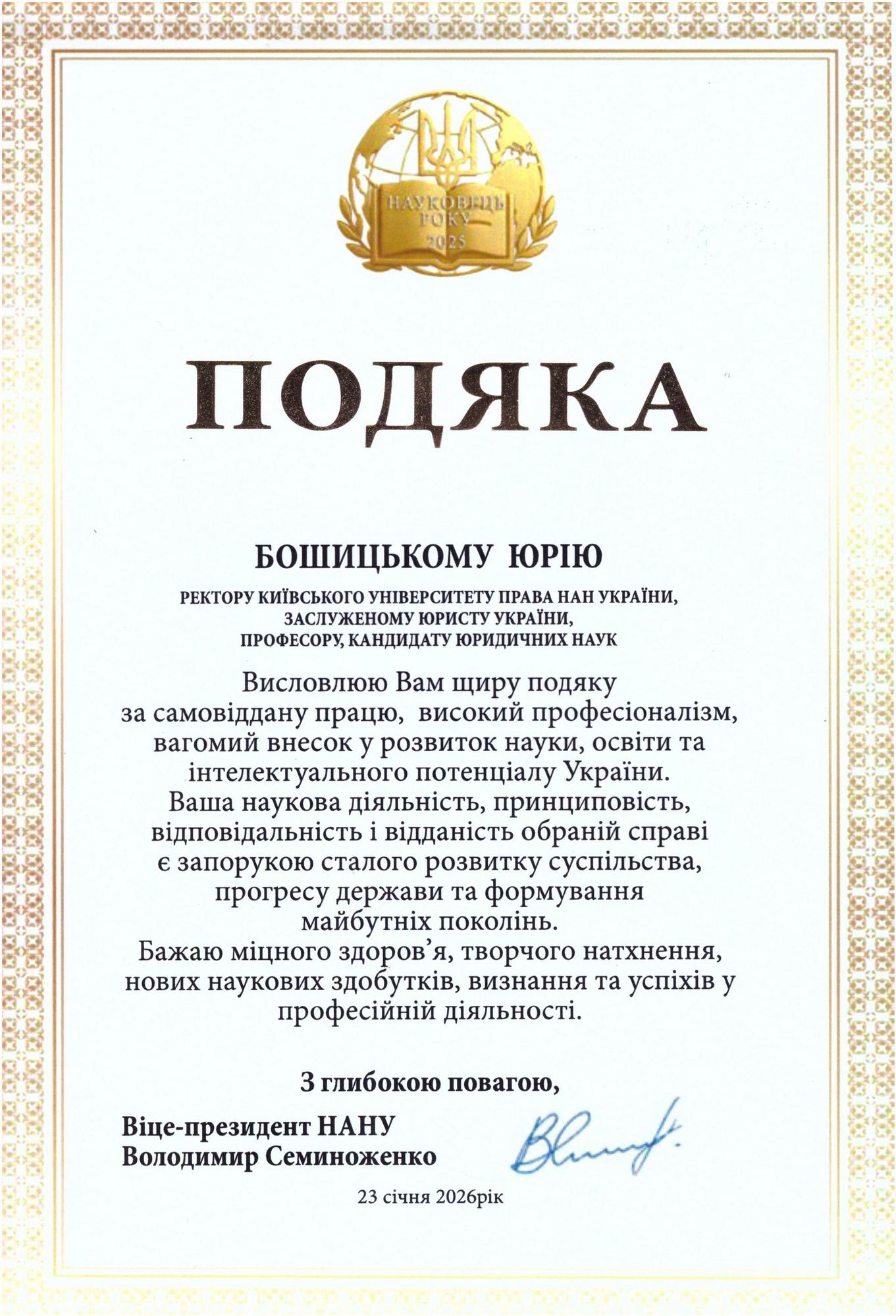 Серед восьмидесяти представників наукової еліти України почесне місце займає Київський університет права НАН України — заклад із тридцятирічною історією, який уже двадцять років успішно працює під керівництвом ректора, професора, заслуженого юриста України Юрія Бошицького, забезпечуючи високий рівень правничої освіти, розвиток міжнародних академічних зв’язків та послідовно утверджуючи свою місію служіння науці, освіті та українській державності.