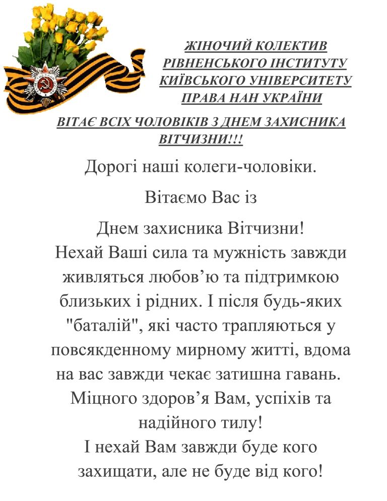 Жіночий колектив Рівненського інституту КУП НАНУ вітає всіх чоловіків з Днем захисника Вітчизни!