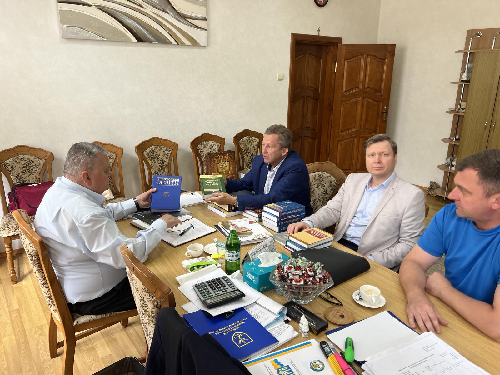 На завершення зустрічі ректор КУП НАНУ Ю. Бошицький традиційно передав для бібліотеки Коледжу правничу літературу в рамках проекту «Популяризація юридичної освіти та професії в колах учнівської молоді України», який проводиться за партнерства видавництва «ЮРІНКОМІНТЕР».